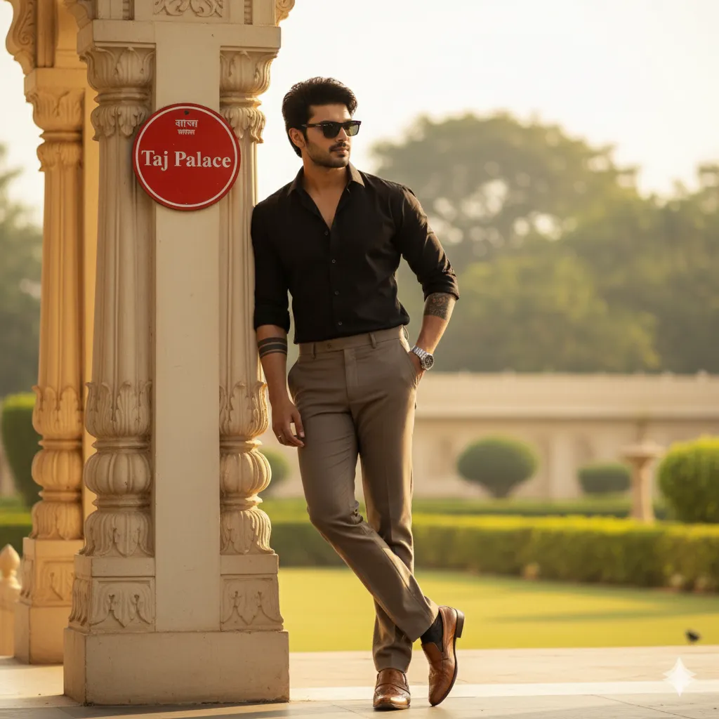 “A stylish man leaning casually against a cream-colored ornate structure with a red round sign that reads Taj Palace. “he has haircut is same style and beardcut is same style and face is same”., and is wearing sunglasses. Outfit: deep red button-up shirt with rolled-up sleeves, tucked into high-waisted taupe trousers, paired with polished brown dress shoes. His pose is confident and relaxed, one hand resting on the structure, the other in his pocket. Background shows trees and