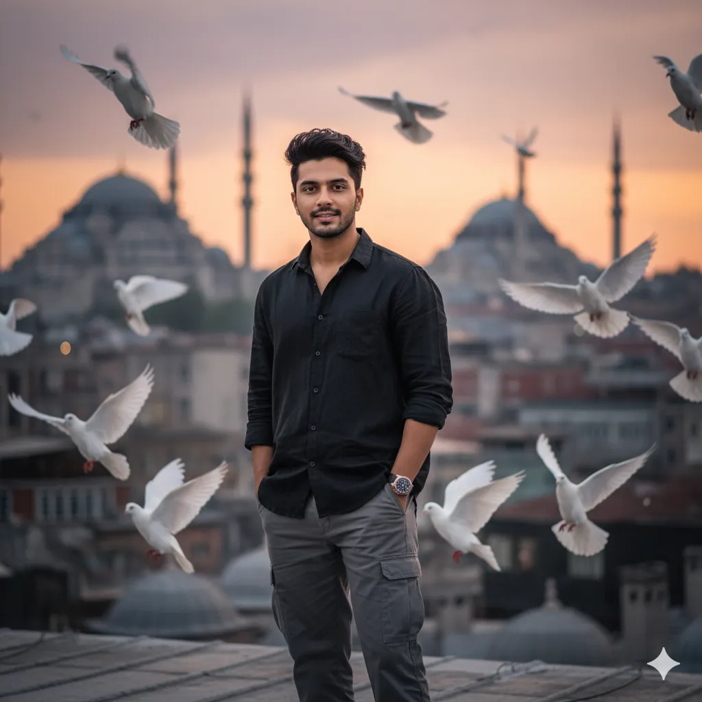 Create a stunning edit of me in Turkey, And 4k HD Istanbul, standing on a rooftop. I am wearing a oversized black linen shirt, grey loose cargo pants white sneakers, watch is left hand, dark hair, sharp jawline, hands in pockets, direct gaze, white pigeons are flying, adding a dreamy and cinematic atmosphere. The background should show Istanbul’s skyline with a magical vibe.