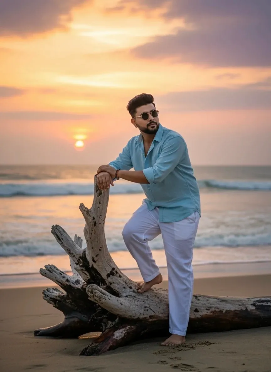 Make my photo like a Hyper-realistic 4K portrait of a 24-year-old indian man (same face & hairstyle as uploaded photo, do not change facial expressions). He leans casually on a large driftwood log at the beach, barefoot, dressed in a light blue linen shirt with rolled-up sleeves, white trousers, and sunglasses. The ocean waves crash gently behind, with the glowing sunset painting the horizon.