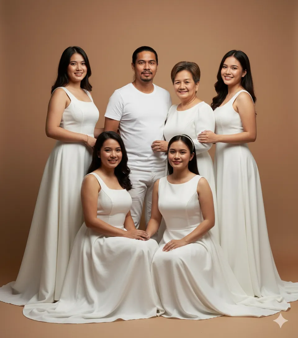 Generate this 6 picture as reference doesn’t change the angle of faces and style of hair cant change. Make a Family portrait. The background is plain creamy brown. HD ULTRA ENHANCE. The filter is like a cinematic with shadows. The man is wearing a simple plain white fitted shirt and white pants with no design just plain. They are smiling softly. All girls are wearing a white gown elegant with no design.