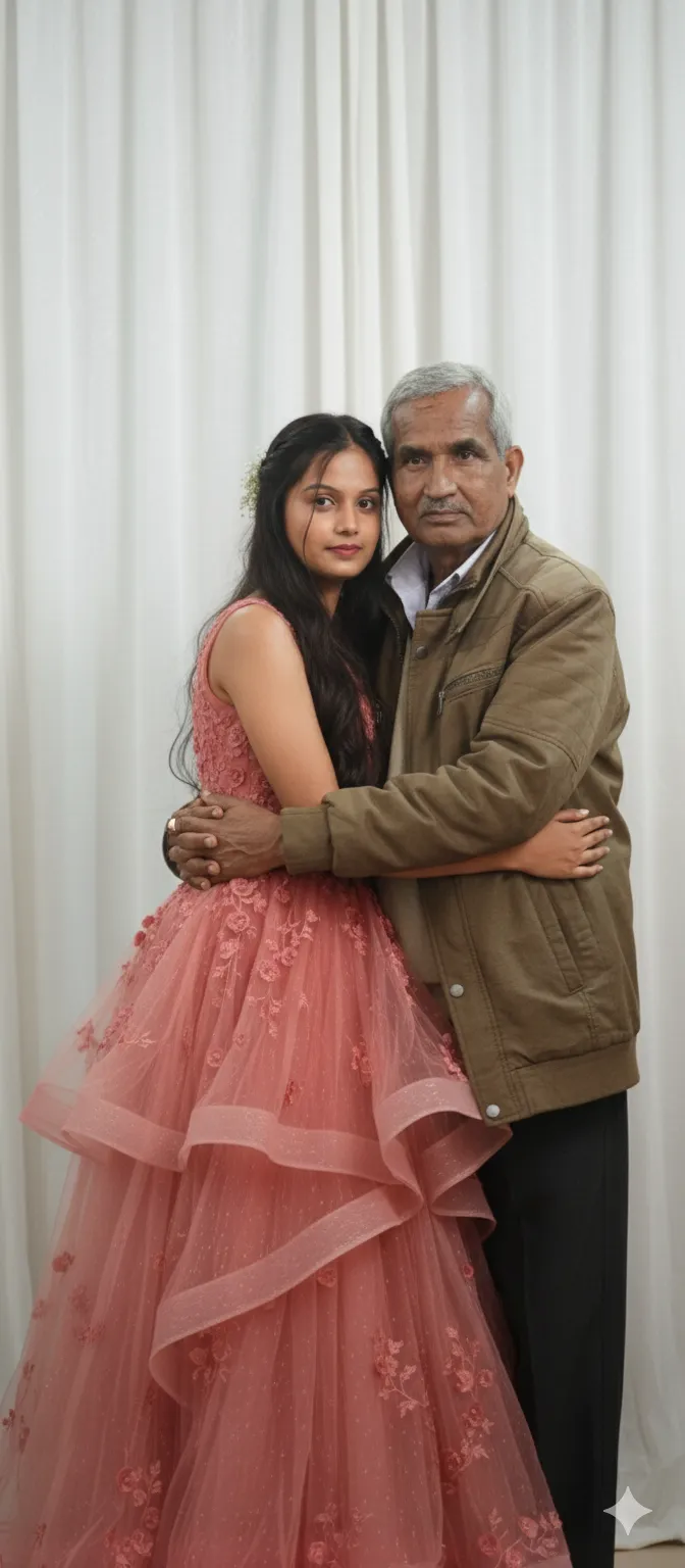 Create a realistic photograph of me and my father standing together in a side-hug pose . The photo should look natural, as if captured by a normal camera, not Polaroid. Keep the faces unchanged. Change the background behind us to white curtains. Ensure the overall image looks sharp, clean, and real, with soft natural lighting (not too dark or overly bright). The photo should give a warm, candid, and authentic family moment feeling.