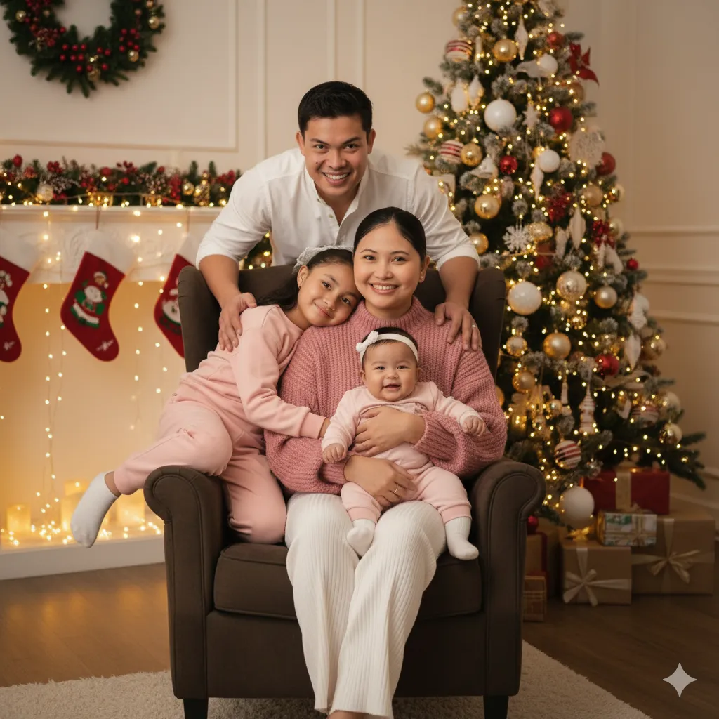 Generate a warm and intimate family photo uploaded portrait featuring two adults and two children in a beautifully decorated, cozy Christmas setting. A woman sits on a plush, brown armchair, holding a baby on her lap. She is wearing a pink-colored knit sweater and long, ribbed white pants. The baby is dressed in light-colored clothing and a headband. Next to her on the armchair, a young girl in a light pink or beige tracksuit is lounging comfortably.