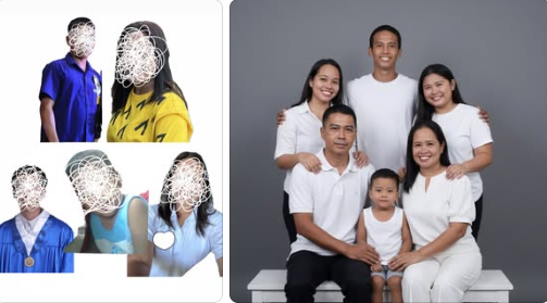 “Make a family picture put them in a pictorial studio with grey background and make them wear white. The 3 on the upper of the picture hug the 3 pictures at the lower side and they are seated in front. Make it realistic don’t change faces look more original.“