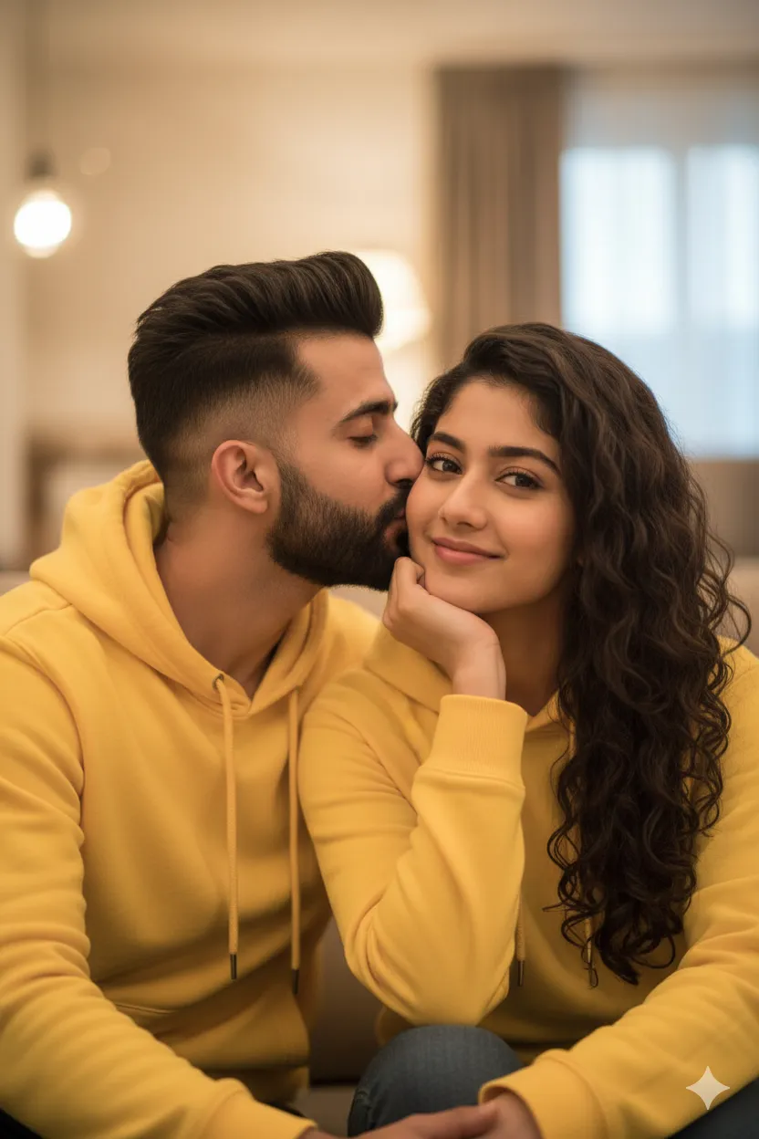 Cute Couple with Yellow Hoodie prompt Prompt:Ultra realistic 8K couple portrait in a soft indoor setting. A young slim-fit boy (replace with my uploaded face) wearing a bright yellow hoodie is sitting very close beside a cute young girl in matching yellow hoodie. The boy is gently giving a soft, sweet closed-mouth kiss on the girl’s cheek, , resting her chin on her hand.