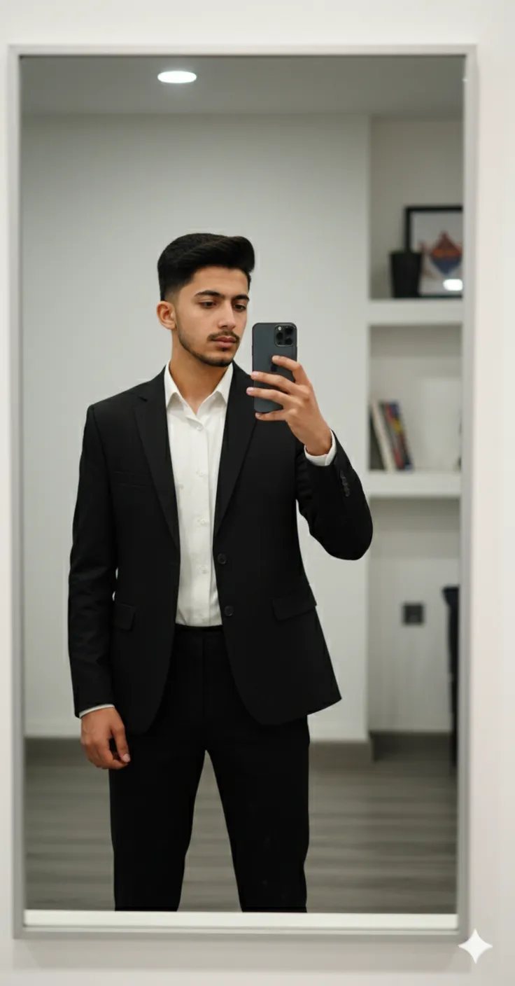 The teenage boy’s face should remain completely unchanged. He is standing in front of a mirror taking a mirror selfie with an iPhone 17 . He is wearing a black blazer and black pants. Under the blazer, he has a white shirt . Apply cinematic professional color grading and keep the image size in 3:4 ratio. The boy’s face should not change at all.