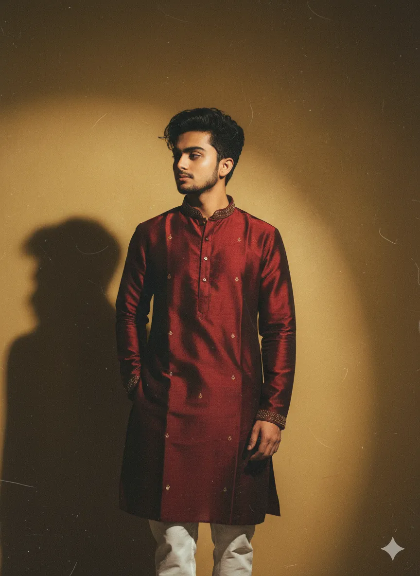 Create a full body retro vintage grainy but bright image of the reference picture styled in a classic traditional Indian kurta pajama.The outfit should be a rich, deep-toned kurta (like maroon or mustard) with subtle embroidery details, paired with crisp white details, paired with crisp white pajama. The look must feel like a 90s Bollywood hero aesthetic sharp, charismatic, and slightly romantic. Hair styled
