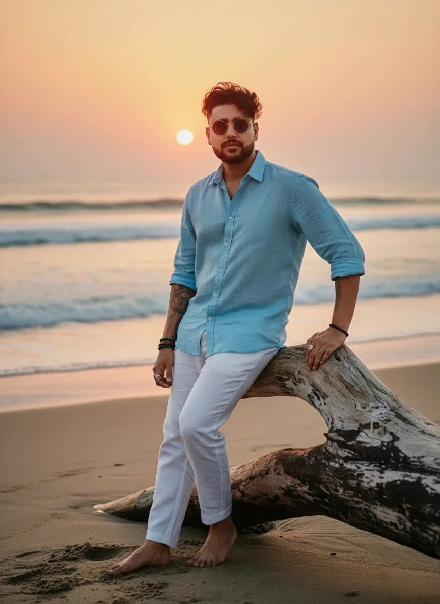 Make my photo like a Hyper-realistic 4K portrait of a 24-year-old indian man (same face & hairstyle as uploaded photo, do not change facial expressions). He leans casually on a large driftwood log at the beach, barefoot, dressed in a light blue linen shirt with rolled-up sleeves, white trousers, and sunglasses. The ocean waves crash gently behind, with the glowing sunset painting the horizon.