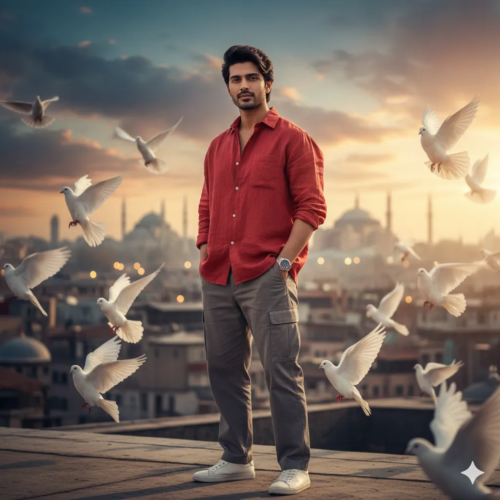 “Dreamy Rooftop Moments ✨🖤✈️ – Boys’ Travel Shot ✨ [Trending Prompt]”👑 Create a stunning edit of me in Turkey, And 4k HD Istanbul, standing on a rooftop. I am wearing a oversized black linen shirt, grey loose cargo pants white sneakers, watch is left hand, dark hair, sharp jawline, hands in pockets, direct gaze, white pigeons are flying, adding a dreamy and cinematic atmosphere.