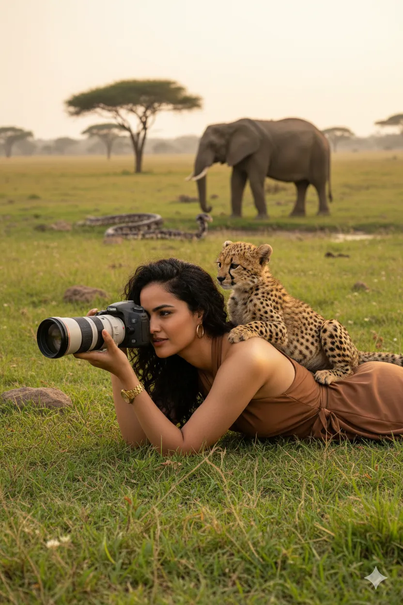 Ultra-realistic wildlife photography scene: An elegant Indian woman in a minimal earthy-toned wrap dress with black gown, lying flat on the grassy ground while holding a professional DSLR camera with a large telephoto lens, intently focusing on elephant , anaconda wildlife. A playful cheetah cub sits on her back, curiously gazing into the distance.