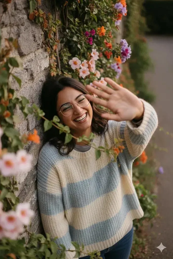 Go to Gemini use nano banana Hyper-realistic overhead 9:16 close-up of myself with glasses, playfully leaning against an ivy-covered stone wall of an old countryside cottage during golden hour. I’m laughing with my head slightly tilted back, one hand brushing away a dangling vine, wearing a textured earth-tone knit sweater layered over a soft white t-shirt. The flowering vines are in full bloom with orange, magenta, and lavender hues, softly blurred in the foreground.