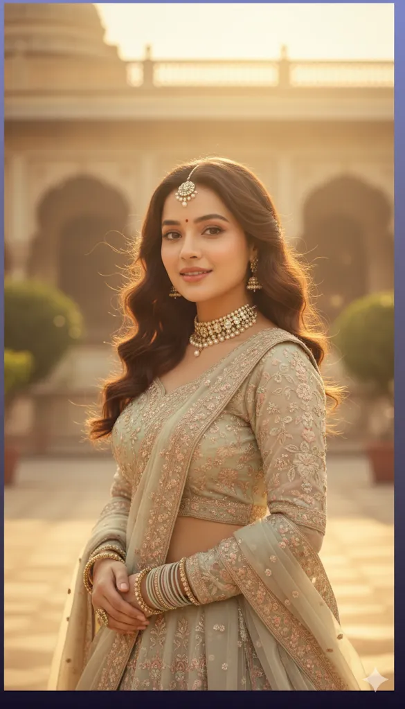A regal vintage-style portrait of my real face with natural features no changing with face, styled as a Maharani. She wears a pastel heavy embroidered lehenga with full-sleeve blouse, ornate flowing dupatta (not on head), light maang-teeka, choker, bangles, and small bindi. Her wavy-curly hair flows softly in breeze. She smiles gracefully in a royal sunlit background, with warm mystical cinematic mood, slightly bright yet elegant HD effect.