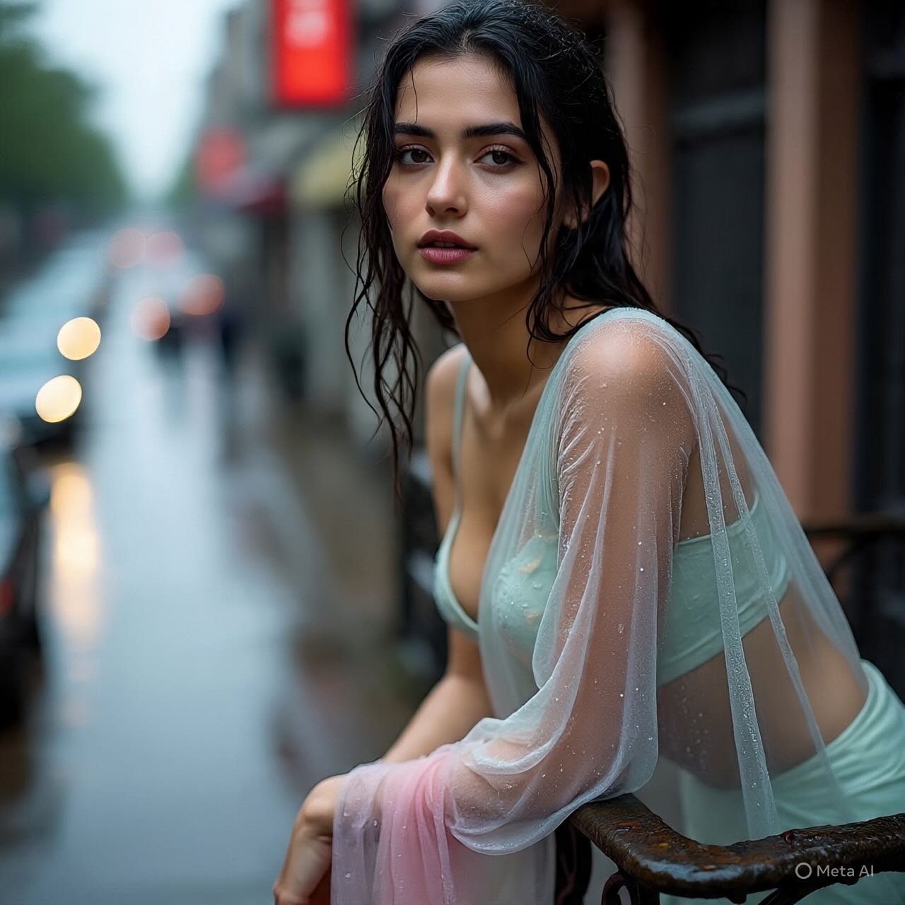 Close-up of a woman in a sheer pastel saree wet under monsoon rain, leaning on an old iron balcony railing. Droplets glisten on her shoulders, blurred neon reflections shimmer on wet city streets below. Shot on Sony A7R V with 50mm f/1.2 lens, cinematic bokeh, editorial fashion mood.