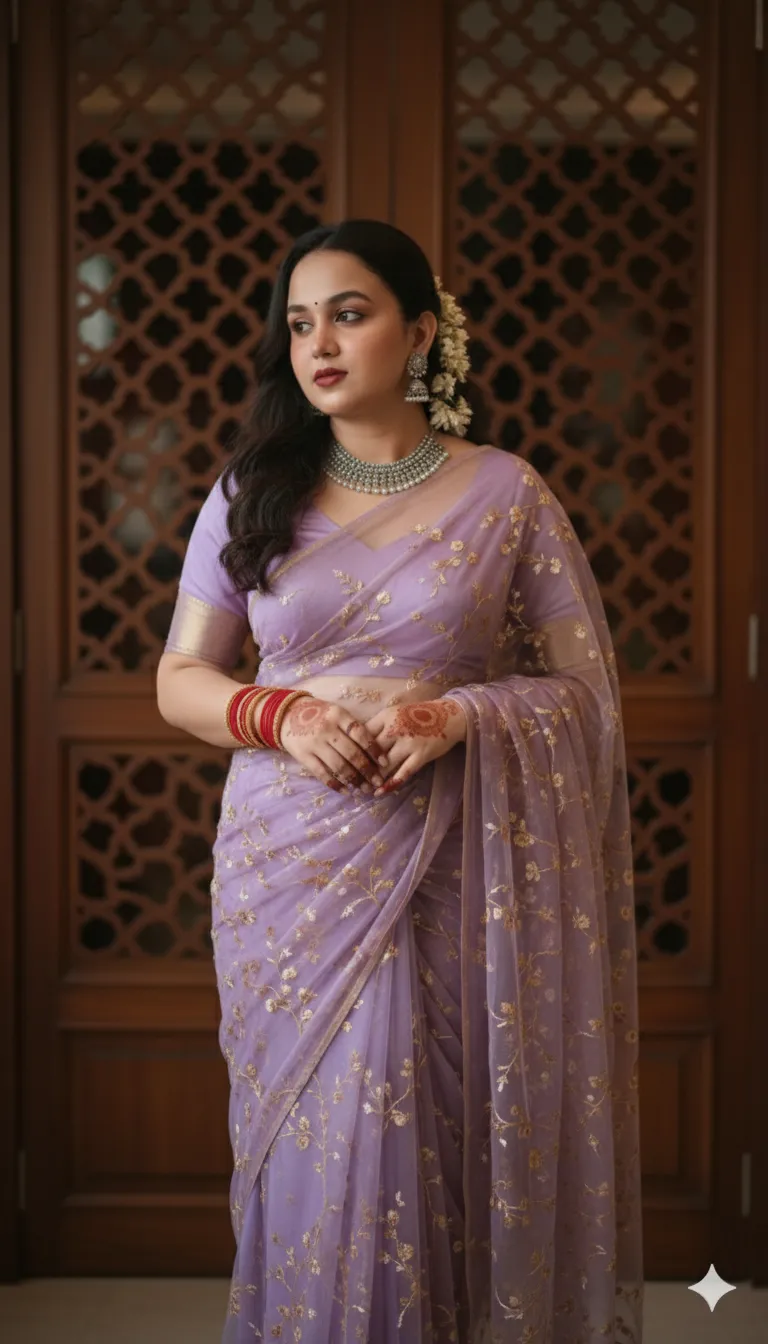 Ultra-realistic cinematic portrait of a South Asian woman in a lavender net saree, delicately embroidered with small golden floral vines. The saree is translucent and ethereal, draped classically across her shoulder and pleated at the waist. She poses near a traditional carved wooden jali screen with intricate geometric cutwork in the background. Her expression is graceful and reflective. Her blouse is sleeveless and closely matching the saree’s lavender tone.