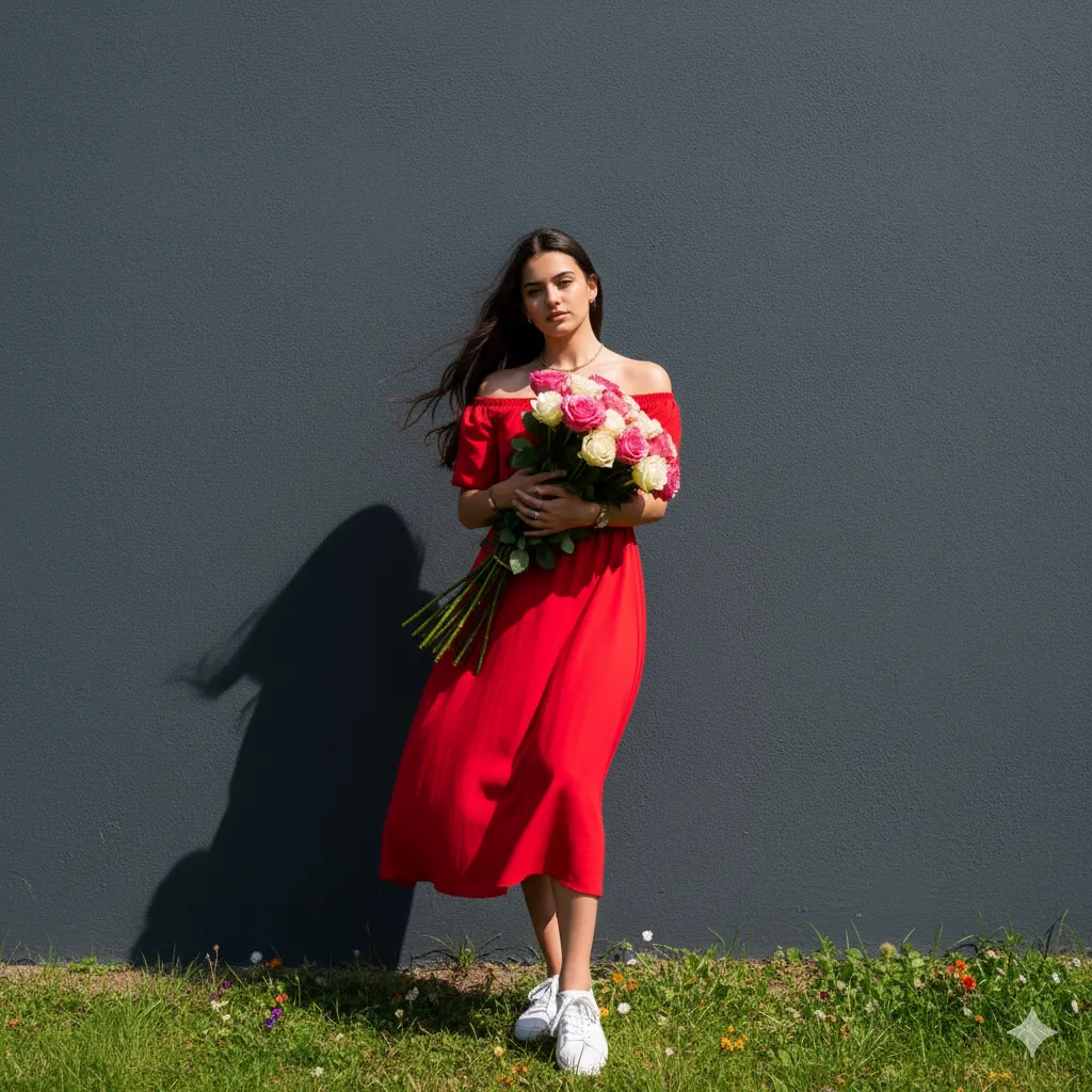 A full-body, camera look-angle portrait of a beautiful 21-year-old girl, approximately 5’6″ tall. She is stand up on the garden in a stylish pose against a solid deep pink-colored wall, with normal shadows creating a 90s movie and romantic, windy environment. She is wearing a perfect black off shoulder dress-colored, retro aesthetic shirt and white