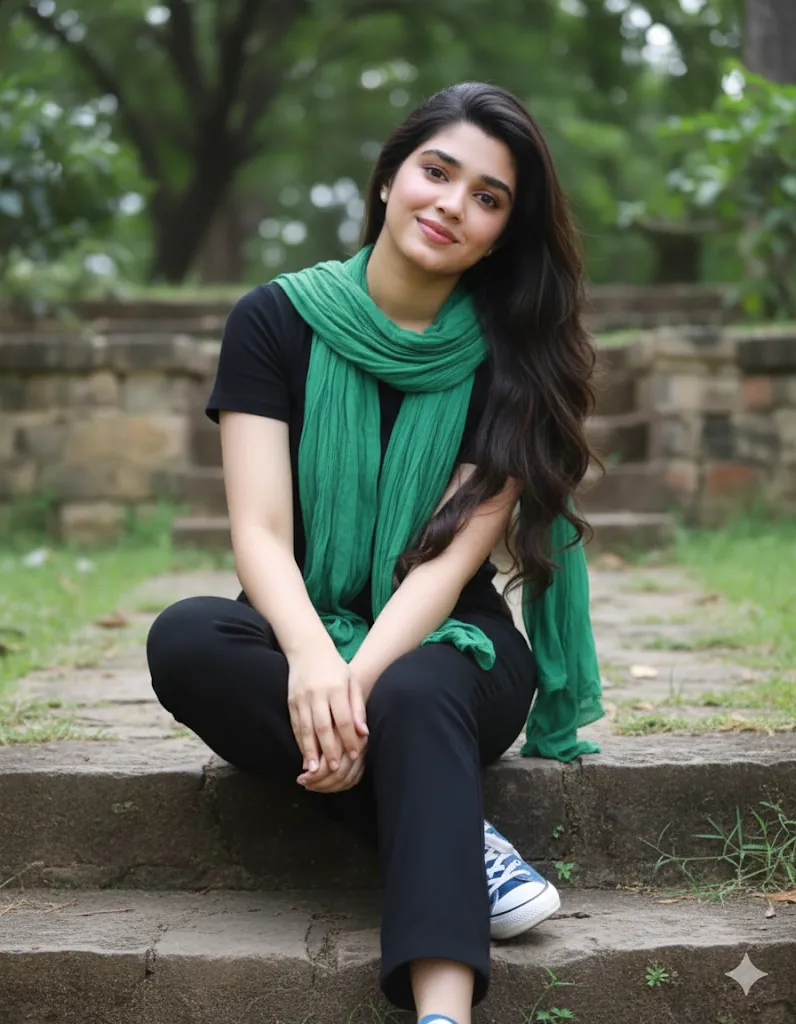 A young girl sitting on stone steps outdoors, black outfit, green scarf, blue-white sneakers, natural greenery background, relaxed smile, realistic photo. Keep same pose, clothes, and background. Auto-generate a new realistic face.