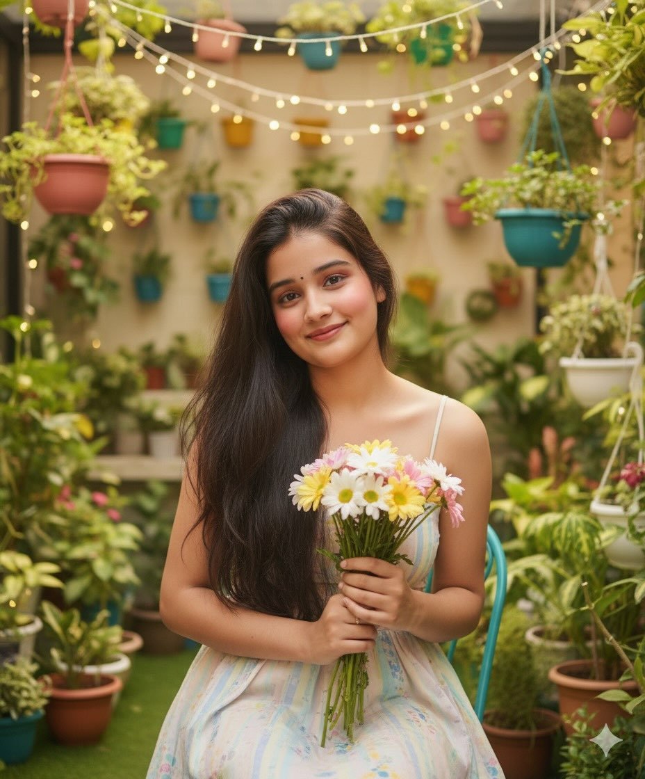 8K ultra-realistic portrait of a young Indian cute girl in a light summer dress, sitting in a cozy café garden with potted plants and string lights. She holds a bouquet of daisies, smiling with cute makeup and soft blush. Warm daylight, pastel tones, soft cinematic lighting, fresh and youthful vibes. Face must match uploaded image exactly (thin, cute, clear, calm). New dress, pose, and hairstyle with very long thick hair flowing to her waist.