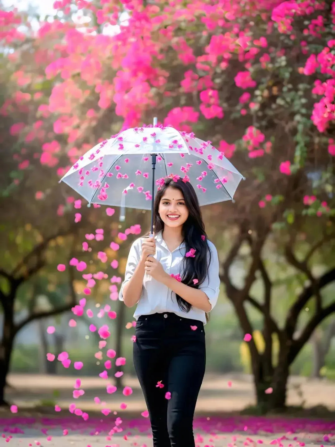A joyful young girls Sidha dekh raha hai standing outdoors holding a transparent umbrella decorated with pink flowers, with vibrant bougainvillea blossoms falling all around her. She is brightly, wearing a light white shirt and black pants. The background is filled with lush pink flowering trees, creating a dreamy, romantic, and lively atmosphere. Captured in a candid, vibrant, and cinematic photography style with natural light and shallow depth of field